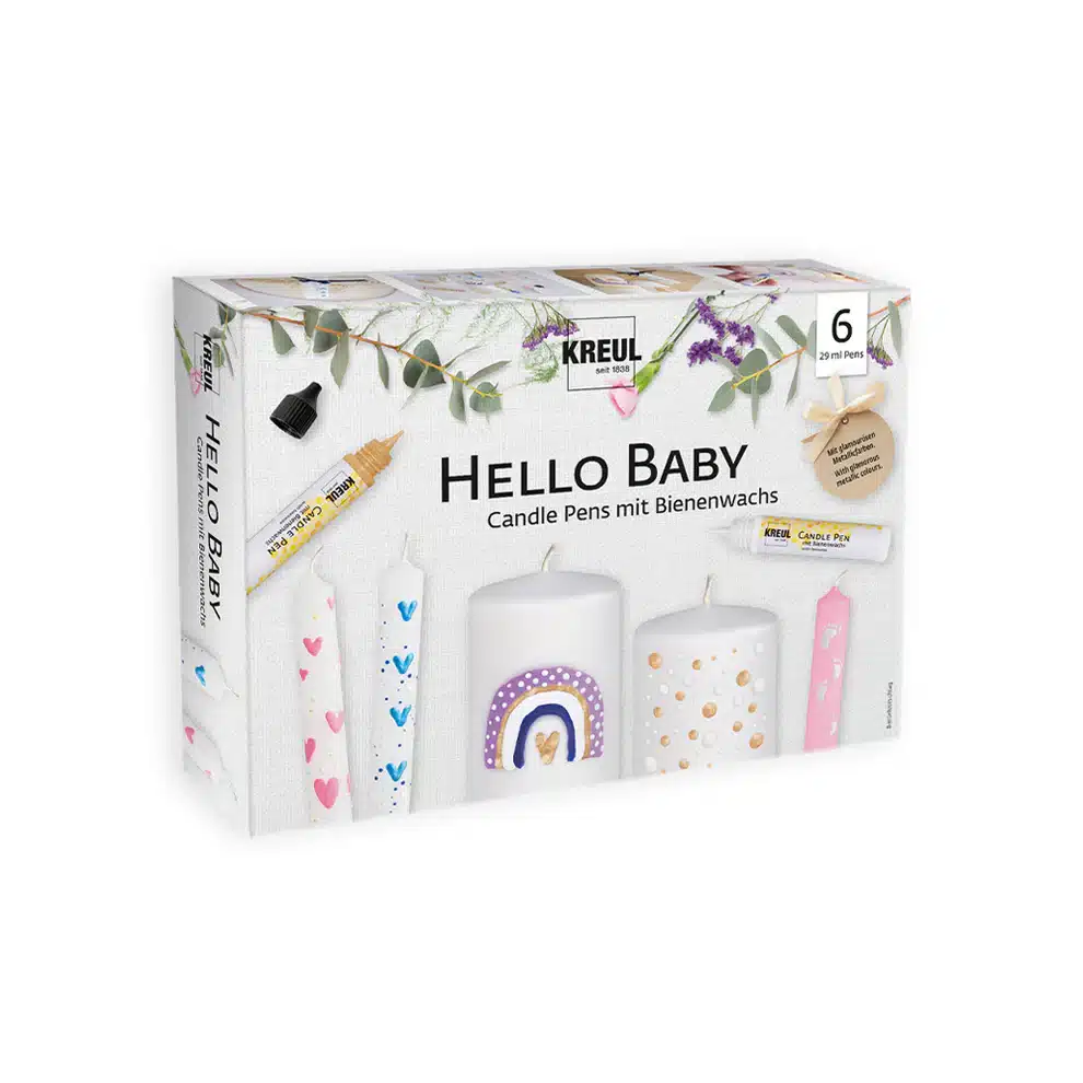 Žvakių dekoravimo rašiklių rinkinys KREUL Hello Baby – tai aukštos kokybės, vandens pagrindo skysto vaško dažų markeriai, skirti kūrybiškam ir profesionaliam žvakių dekoravimui.